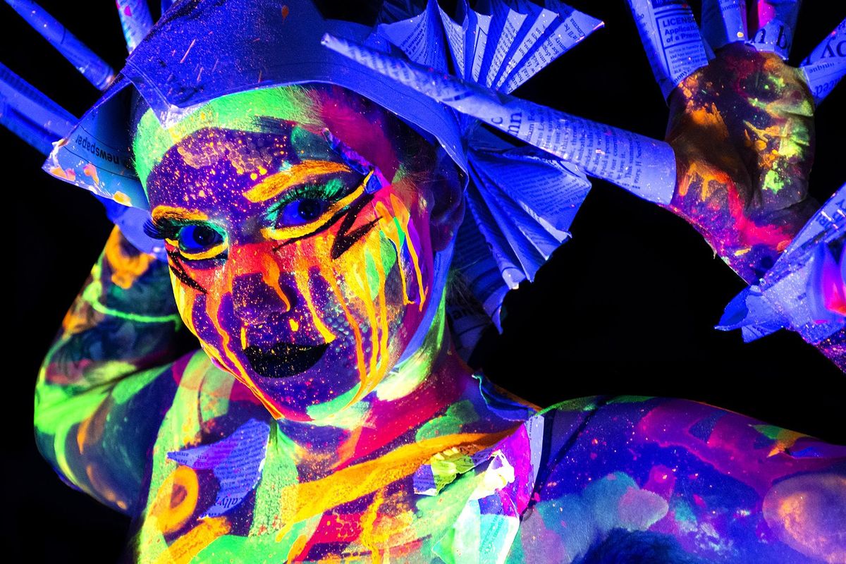 Neon Naked is a unique life drawing experience that specializes in creating unusual and creative designs by using vibrant and bold living sculptures. By combining UV light and reactive body paints with hand-crafted flamboyant accessories it's easy to get the creative juices flowing.