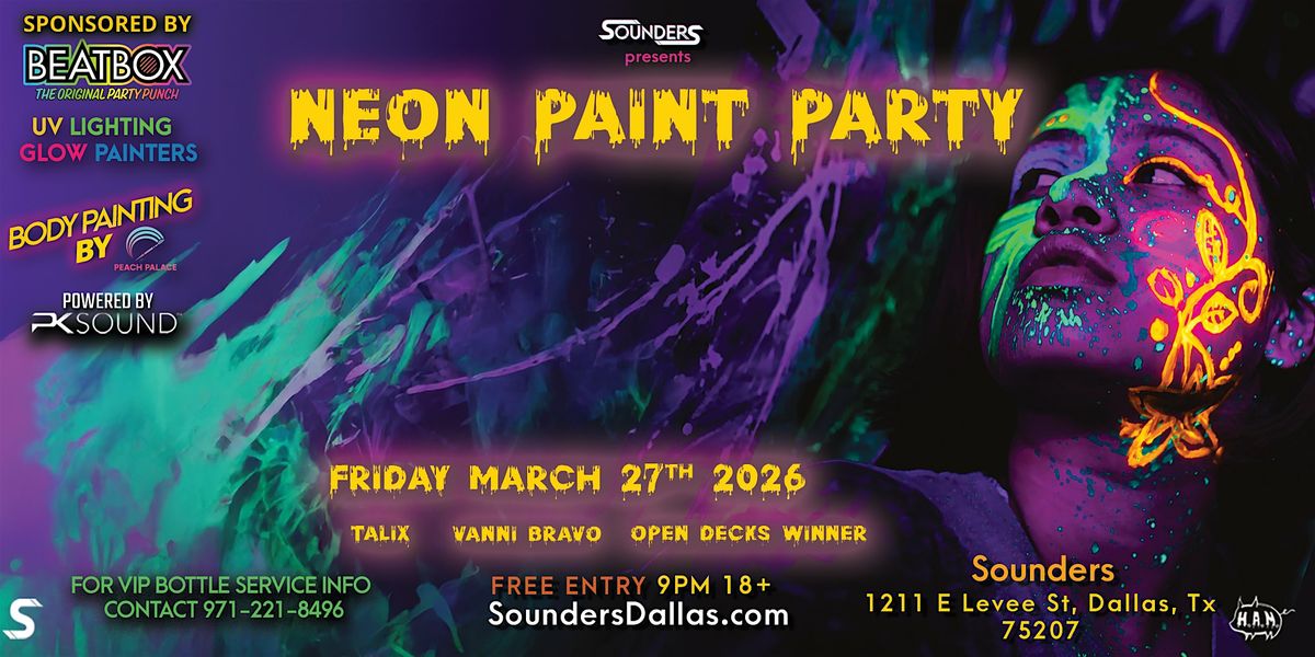 Get ready to glow all night at Dallas' hottest new venue — Sounders — for a Neon Paint Rave like no other! Whether you're into house, dubstep, or EDM, this night is about turning up the energy and lighting up the dance floor.
