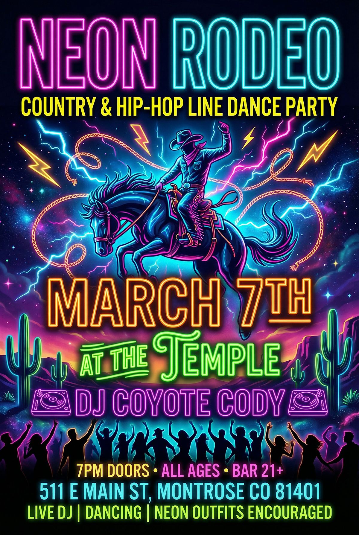 Saddle up for a night where the wild west meets electric glow. Neon Rodeo is taking over The Temple with a full-throttle country dance party lit in bold neon and outlaw energy.