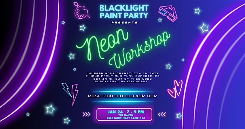 In this 2 hour workshop you will be provided a canvas to take home, paint, brushes, easel, and guidance by fabulous local teachers. Anticipate fun vibes, upbeat jams, and learn new skills all in an out-of-this world black light art gallery environment.