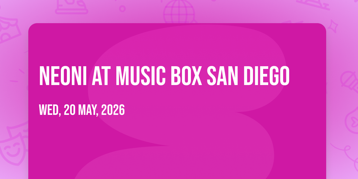 π Welcome to Neoni at Music Box San Diego, where the impossible becomes possible and dreams take flight! ποΈ Join us at Music Box San Diego in the heart of San Diego, CA for an event that will redefine your expectations. π On May 20th, 2026 at 08:00 PM, witness the transformation of space and time into something truly magical. β¨ It's a curated experience combining the best of innovation, entertainment, and community spirit, creating moments that will be remembered for years to come. Whether you're a first-time visitor or a seasoned enthusiast, prepare to be amazed. π Book now to ensure your place in this unforgettable experience!