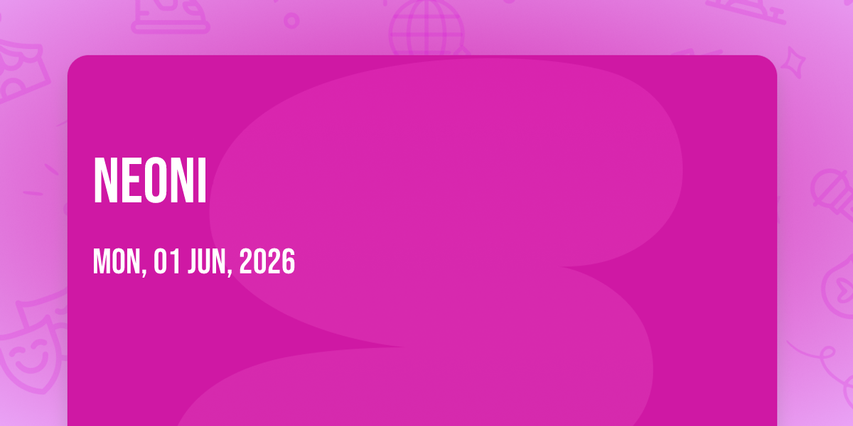 β¨ Enter a world of endless possibilities at Neoni, where every moment tells a story! ποΈ The stunning Blueberry Hill Duck Room in vibrant St. Louis, MO transforms into a realm of wonder on June 1st, 2026 at 06:00 PM. π They have crafted an experience that goes beyond the ordinary, combining elements of surprise, delight, and pure entertainment. Every detail has been thoughtfully considered to ensure your journey with us is nothing short of extraordinary. π― Join fellow adventure seekers and memory makers in this celebration of imagination and innovation. π Reserve your spot today and be part of something truly special!http://maps.seatics.com/GeneralAdmissionEvent_2019-01-14_1230_SVGC_tn.gif