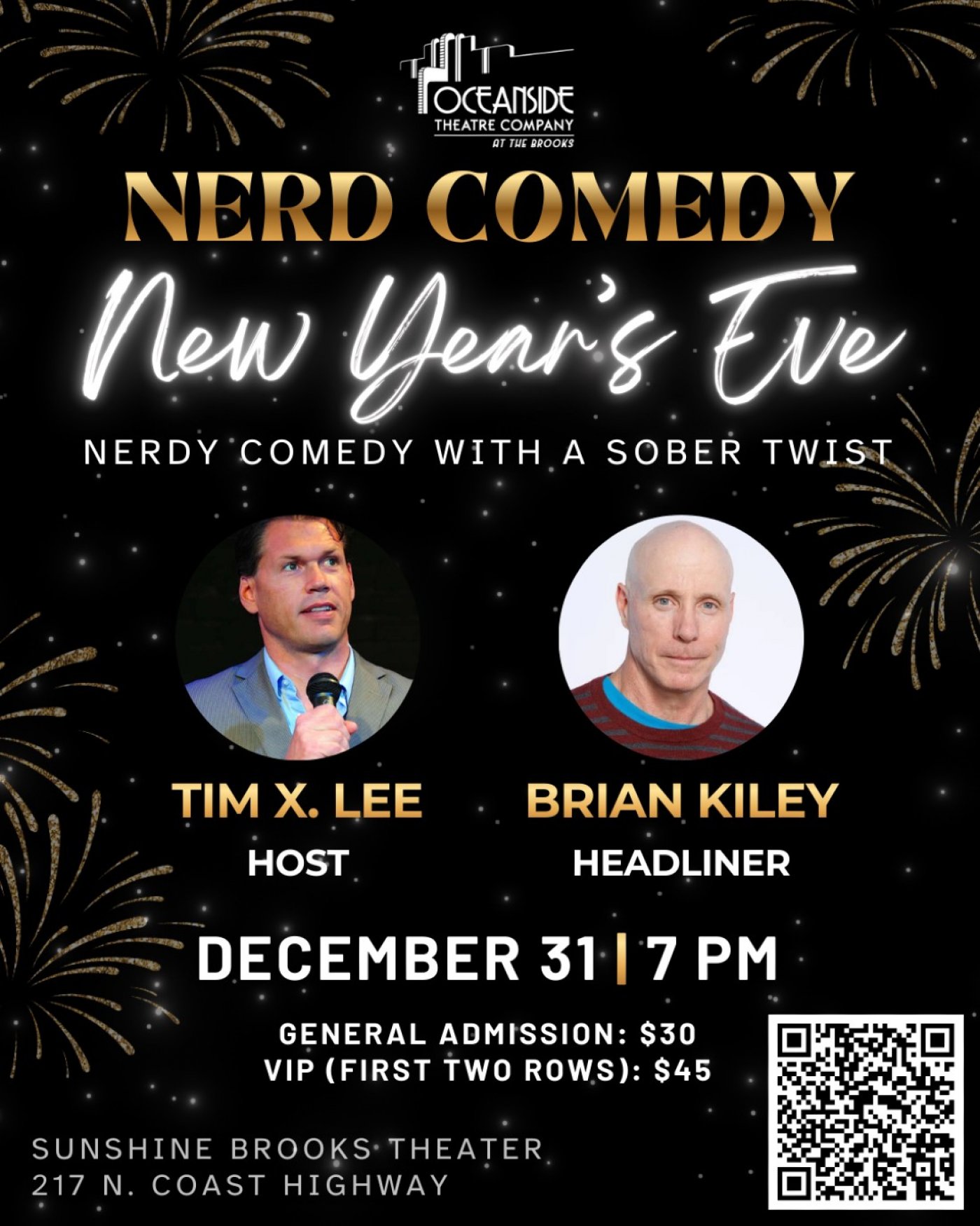 Ring in the New Year with laughter at a sharp, alcohol-free comedy show at the historic Sunshine Brooks Theater (217 N. Coast Highway, Oceanside, CA). Hosted by Tim X Lee and headlined by Brian Kiley, this smart, relaxed night of stand-up is perfect for audiences looking to start the year laughing — no hangover required.