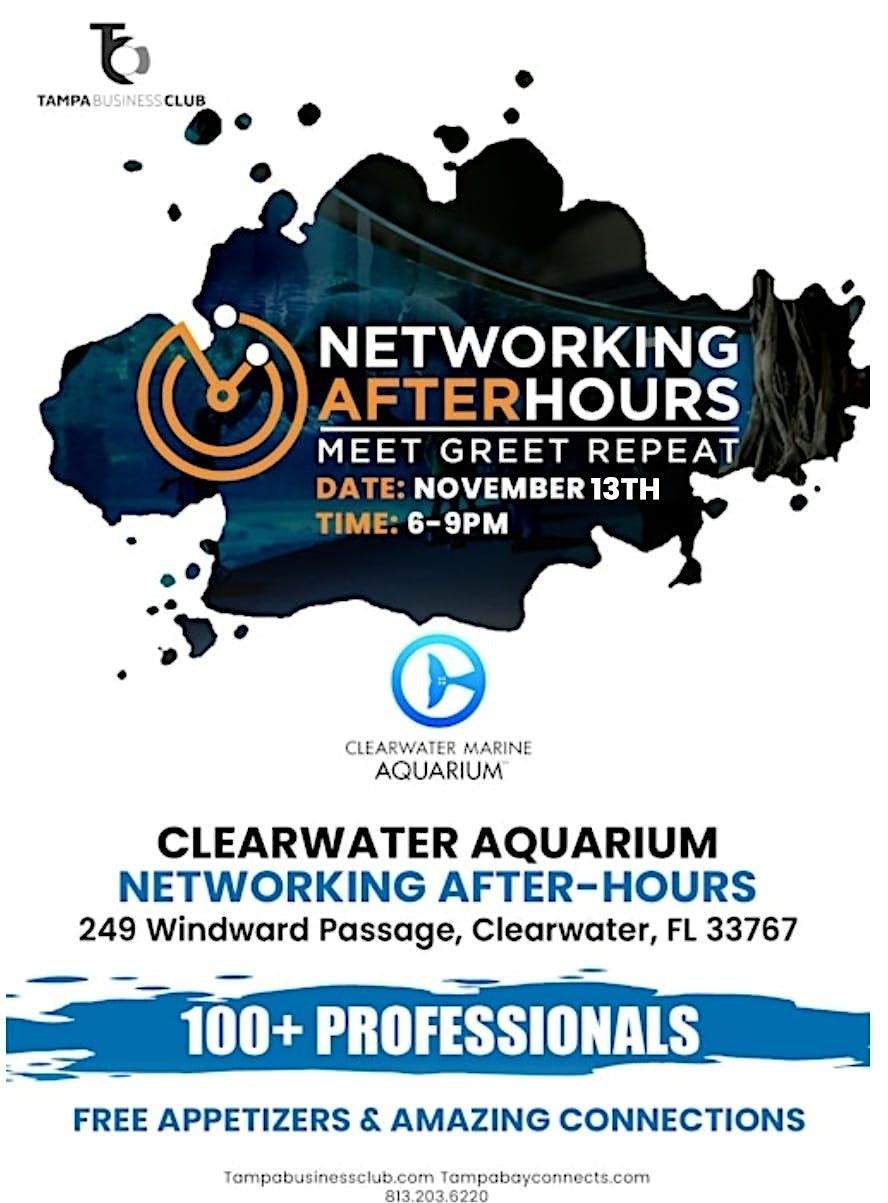Welcome to **Networking After-Hours at the Clearwater Aquarium**! Join a packed room of professionals for an evening of networking and fun at the Clearwater Marine Aquarium. This event is a great opportunity to connect with like-minded individuals in a relaxed and casual setting. Whether you're looking to make new business contacts or simply enjoy a night out with colleagues, this event is perfect for you. Don't miss out on this chance to expand your network and have a great time! See you there on **Thu Nov 13 2024** at **6:00 PM**!