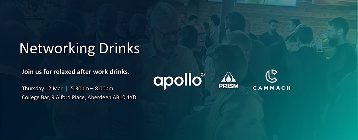 Apollo, Prism Energy and Cammach are hosting a networking drinks evening on Thursday, 12th March from 5.30-8pm. The event is being held at The College Bar, 9 Alford Place, Aberdeen and is open to all energy sector professionals who would like to join us.