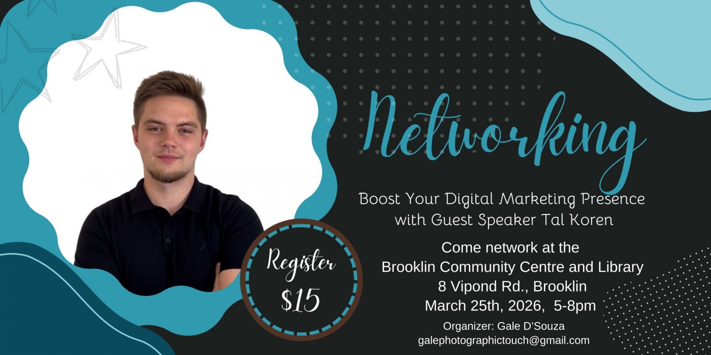 Join us on Tuesday, March 25th at 5:00 PM at the Brooklin Community Centre and Library for an interactive networking event focused on helping entrepreneurs and professionals strengthen their digital marketing presence and increase engagement.