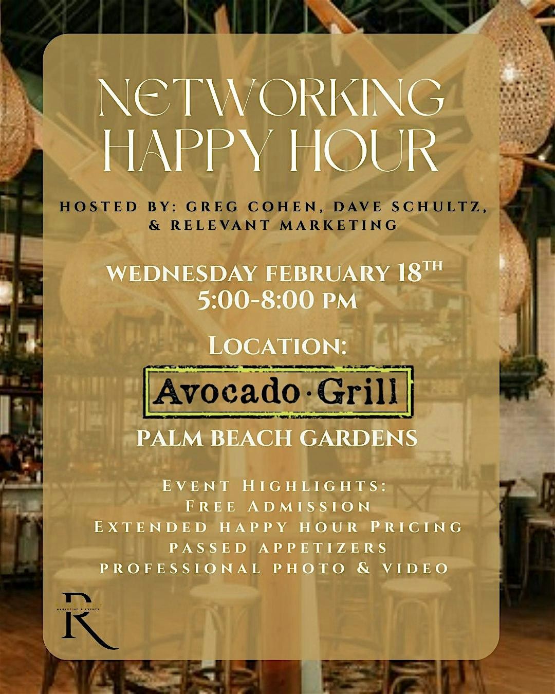 Join us for our first Networking Happy Hour of the year! Hosted by Greg Cohen, Dave Schultz, & Relevant Marketing and Events.