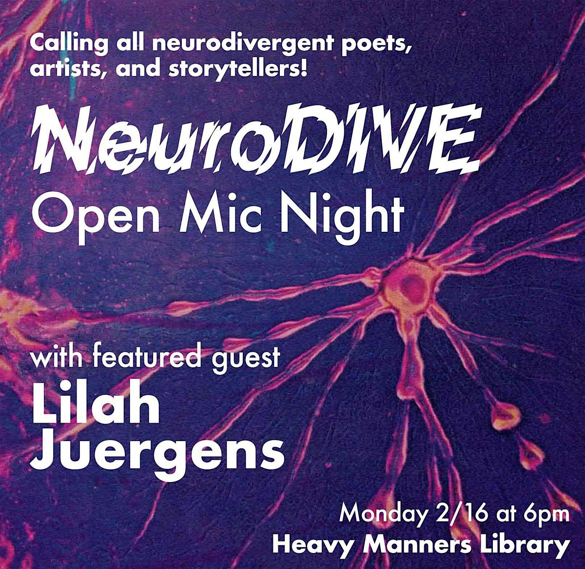 NeuroDIVE Open Mic is an open mic specifically geared towards neurodivergent artists/poets/comedians. Neurotypical artists and allies are welcome.