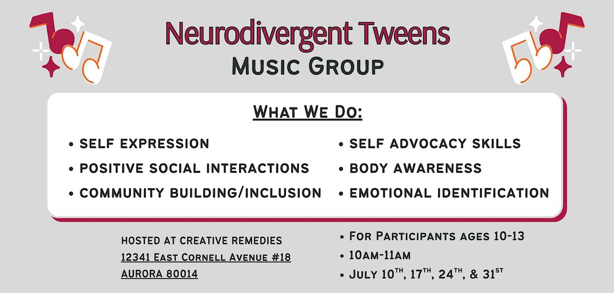 Who Can Join: Neurodivergent tweens ages 10-13 looking to build connections, enhance communication skills, and explore self-expression through music.
