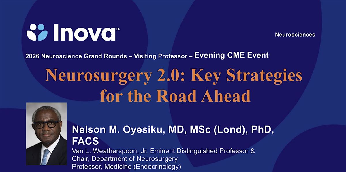 Inova Health System invites physicians and healthcare professionals to an in-person evening Continuing Medical Education (CME) dinner featuring Nelson M. Oyesiku, MD, MSc (Lond), PhD, FACS, Van L. Weatherspoon, Jr. Eminent Distinguished Professor & Chair of Neurosurgery at the University of North Carolina at Chapel Hill.