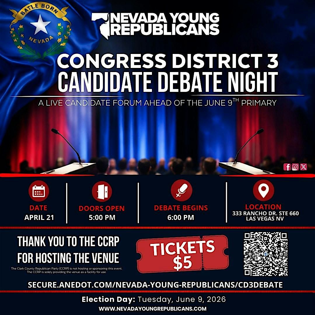 The Nevada Young Republicans invite you to attend the official Congressional District 3 Candidate Debate ahead of the June 9 primary election.