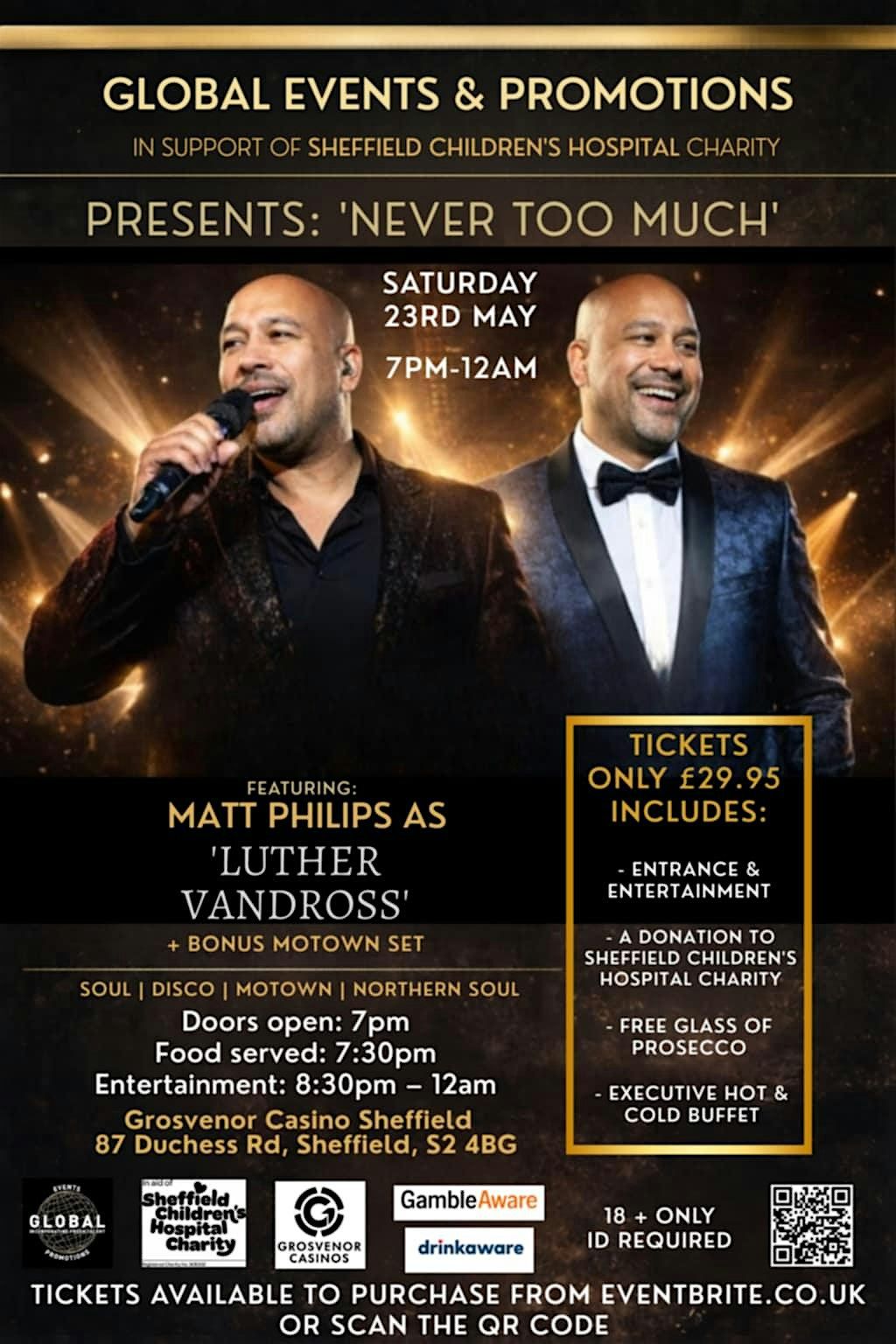 Global Events & Promotions, in support of Sheffield Children's Hospital Charity are both proud and excited to bring you a fantastic evening of great entertainment with special guest singer MATT PHILIPS performing live as LUTHER VANROSS with a BONUS Motown set to follow.. Music will be powered by DJ RICH FORD who will keep the entertainment going until 12AM.. Doors open from 7pm and there will be an Executive Hot & Cold Buffet, along with a FREE glass of Prosecco served from 7.30pm, followed by music & entertainment..Tickets are only £29.95 for all that great entertainment and 5% of the ticket sales will be donated directly to SCHC.. Tickets available from EVENTBRITE.CO.UK with NO booking fees..