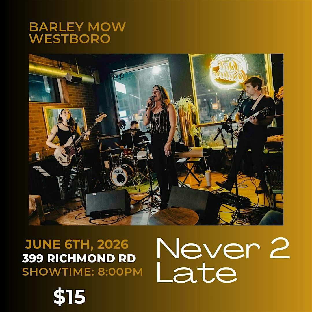 Get ready for an awesome night as Never2Late hits the stage! Join us at the Barley Mow Westboro for some great vibes and live tunes. Half of the proceeds will be donated to the Parkdale Food bank.