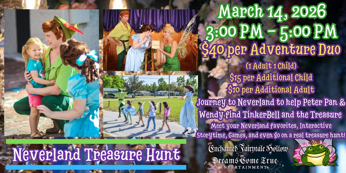 Join us for a Real Live Treasure Hunt of epic proportions with tons of adventure, magic and fun! Guests will get a chance to participate in a two part adventure starting with a treasure map and mini side quests they can do in their very own kingdom. Then, on the big day, follow the second star to the right and straight on til morning to Enchanted Fairytale Hollow where Wendy and Peter Pan will tell a story from their adventures tons and lead you on a treasure hunt with clues, sword fighting, fun and games! Find out who is guarding the treasure and take a piece back home with you. Meet, Greet and Adventure with your favorite Neverland Friends where it is bound to be a spectacular time for the whole family. There is lots of fun and excitement in store, you don't want to miss this exclusive event!