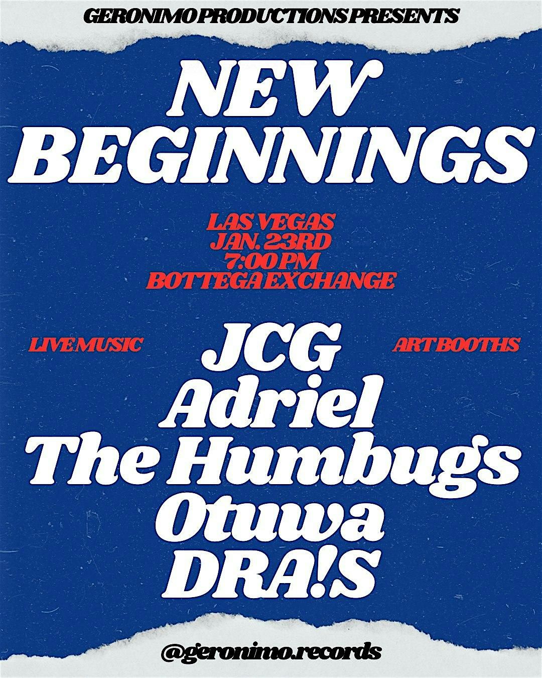 Geronimo Productions is back with their third show, New Beginnings! This live music show kicks off the new year by introducing more talented, young, and hungry artists into the picture. In a new venue, everything is bigger, better, and bolder. There will be five art vendors, 5 artists, and lots of music. Come ready to hear the heart of the undergound music scene of Las Vegas.