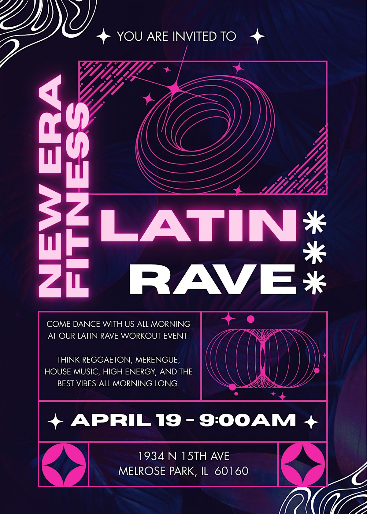 Get ready to move and groove at the New Era Fitness Latin Rave! This in-person event is all about bringing the heat with sizzling Latin beats and high-energy workouts. Whether you're a dance pro or just looking to have fun, this rave will keep you pumped. Join us for an unforgettable session full of rhythm, sweat, and good vibes. Let's turn fitness into a party and dance our way to a healthier you!