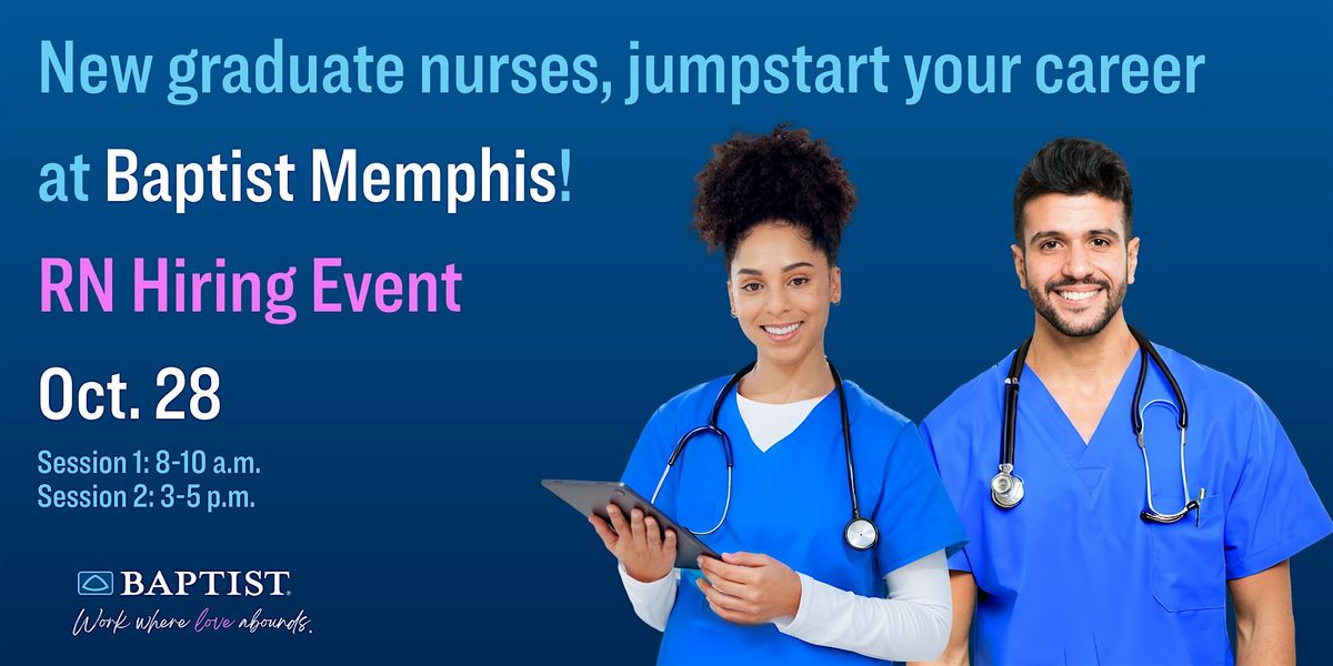Baptist Memorial Hospital-Memphis, designated as the Memphis area's No. 1 hospital, is hosting an in-person hiring event on Tuesday, October 28 for new graduate nurses. We are looking for motivated, passionate new nurses who are ready to make a difference in health care and the Memphis community.