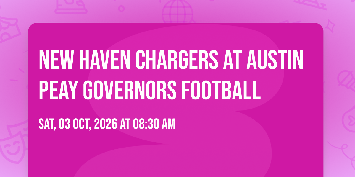 π Location: 36.532, -87.3522π Welcome to New Haven Chargers at Austin Peay Governors Football, where dreams come alive and possibilities are endless! ποΈ Join us at Fortera Stadium in the heart of Clarksville, TN for an event that defies expectations. π On October 3rd, 2026 at 08:30 AM, be part of something truly extraordinary as we bring together innovation, entertainment, and pure magic. β¨ Every aspect has been carefully designed to ensure an unforgettable experience for all our guests. Whether you're seeking adventure, inspiration, or simply a break from the ordinary, this event promises to deliver beyond your wildest dreams. π Prepare for a journey into the extraordinary!