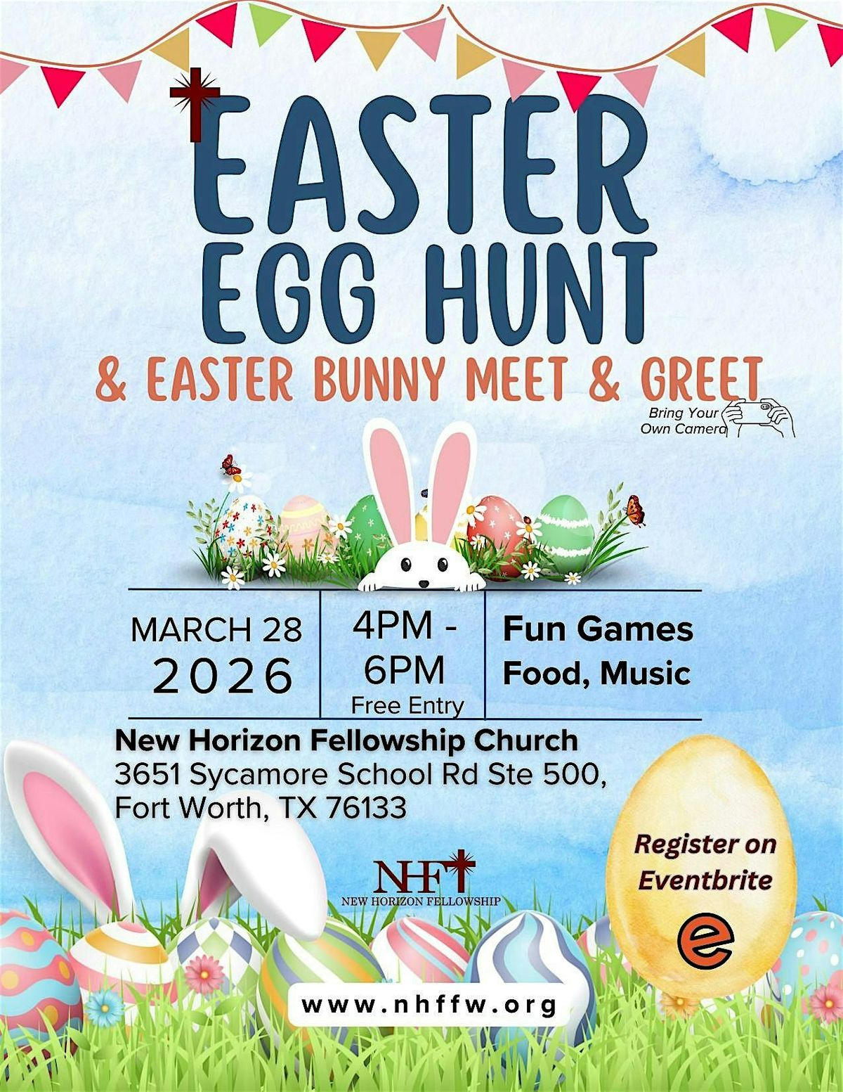 It is that time of year again! New Horizon Fellowship is hosting our annual Easter Egg Hunt, and we would love for you to join us.Please note that we have a new time this year, from 4:00 PM to 6:00 PM . Come enjoy an afternoon of fellowship and activities, including a meet and greet with the Easter Bunny. The Easter Egg Hunt will be immediatley following the activities.