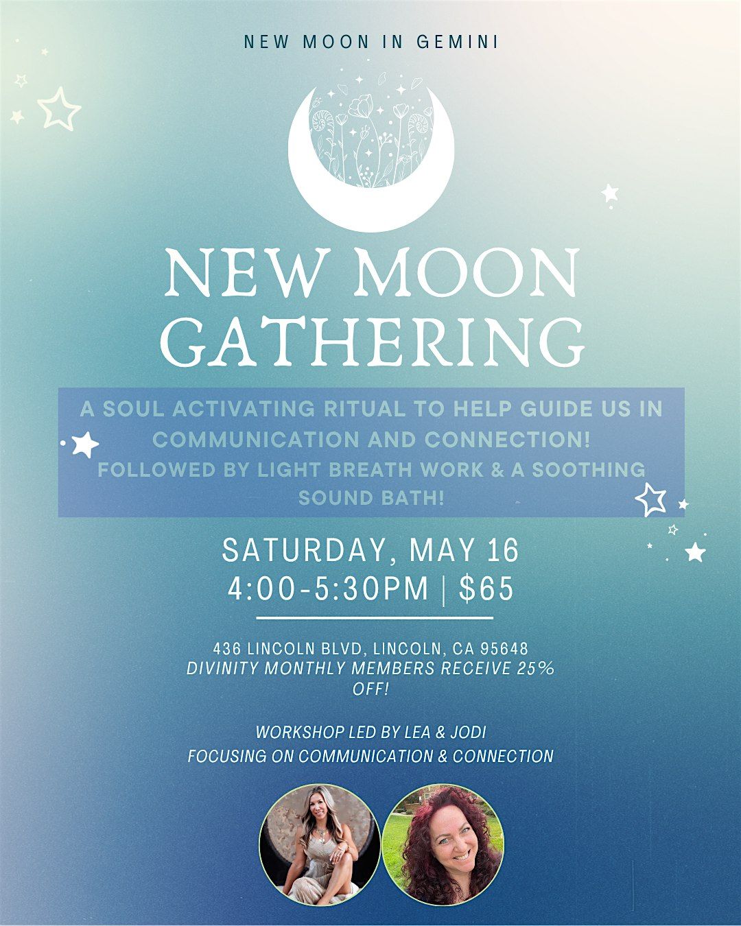 Join us for a soulful evening of intention, connection, and renewal under the New Moon in Gemini—a powerful time to align with your voice, clarity, and inner truth.