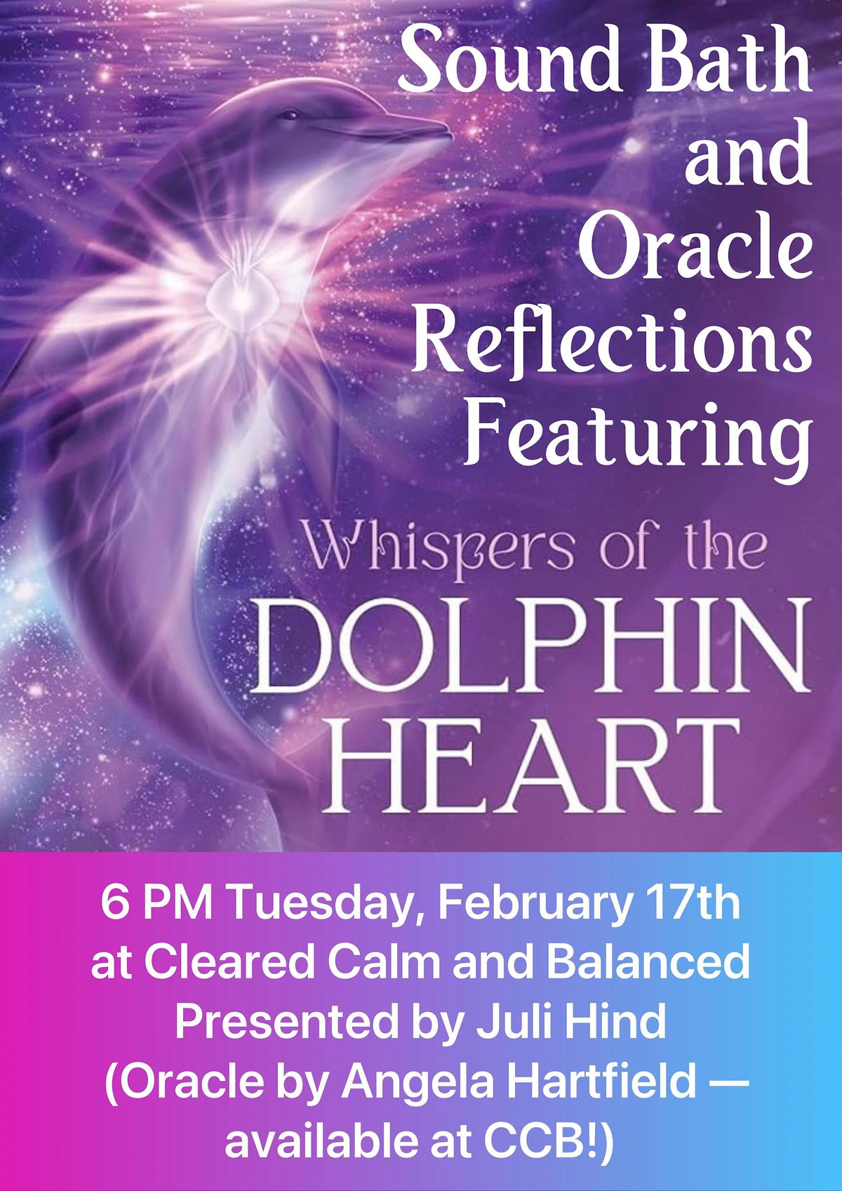 Immerse yourself in healing vibrations including crystal bowls, tibetan bowls, gong and chimes. This sound bath also may be augmented with digital sound. Have you ever wheard a " dolphin bowl" sing? Well you will! Tune into the "Whisperings of the Dolphin Heart." The Oracle will open up your personal insights and reflections even further! You will want to take notes and carry these messages with you through 2026!