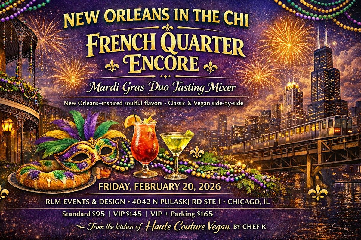 French Quarter Encore is a Mardi Gras-themed Duo Tasting Mixer celebrating New Orleans–inspired soulful flavors — served Classic + Vegan side-by-side so everyone can enjoy the same tradition, two ways.
