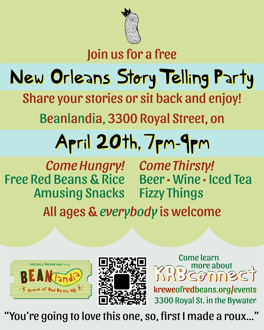 If your style leans towards enjoying great storytellers in action, there's absolutely a spot for you. Bring a friend, sit back, enjoy a beverage, and feast on some gloriously good beans and rice.TED talks have their place in life and absolutely isn't it. See you then!