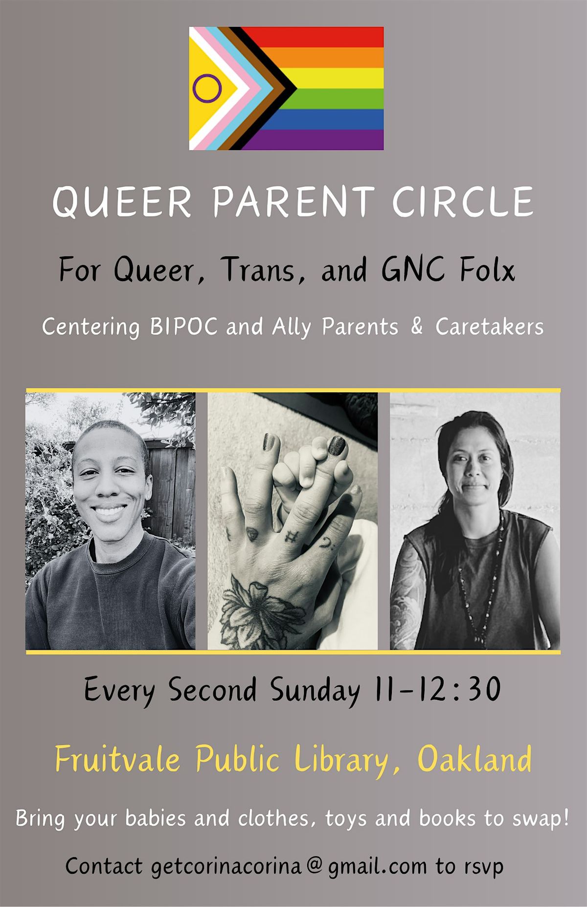 We will be gathering monthly in a facilitator-lead circle to openly share about the joys and challenges of being a new parent/caregiver while building community with other queer families.