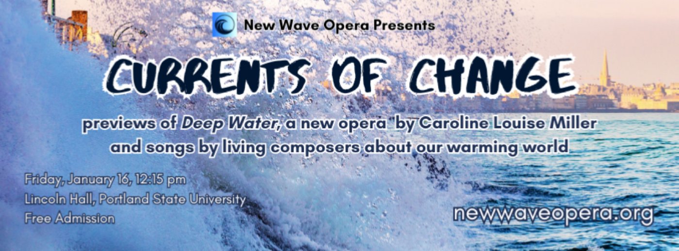 New Wave Opera (NWO) presents Currents of Change, an examination of our warming world through opera, in collaboration with Portland State University’s Music @ Midday concert series. This free lunchtime concert features exclusive previews of Portland composer Caroline Louise Miller’s opera Deep Water, which NWO will premiere in June 2026. Deep Water is a post-apocalyptic fantasy opera that investigates rage, grief, play, & persistence in the face of gargantuan, destructive forces. Queer teenage companions Val & Bluejay chronicle the fall of humanity during the Anthropocene, acting as witnesses and documentarians and finding resilience through love and play. Deep Water positions 2 queer teenagers in the role of history-creation, defining what is worth preserving.