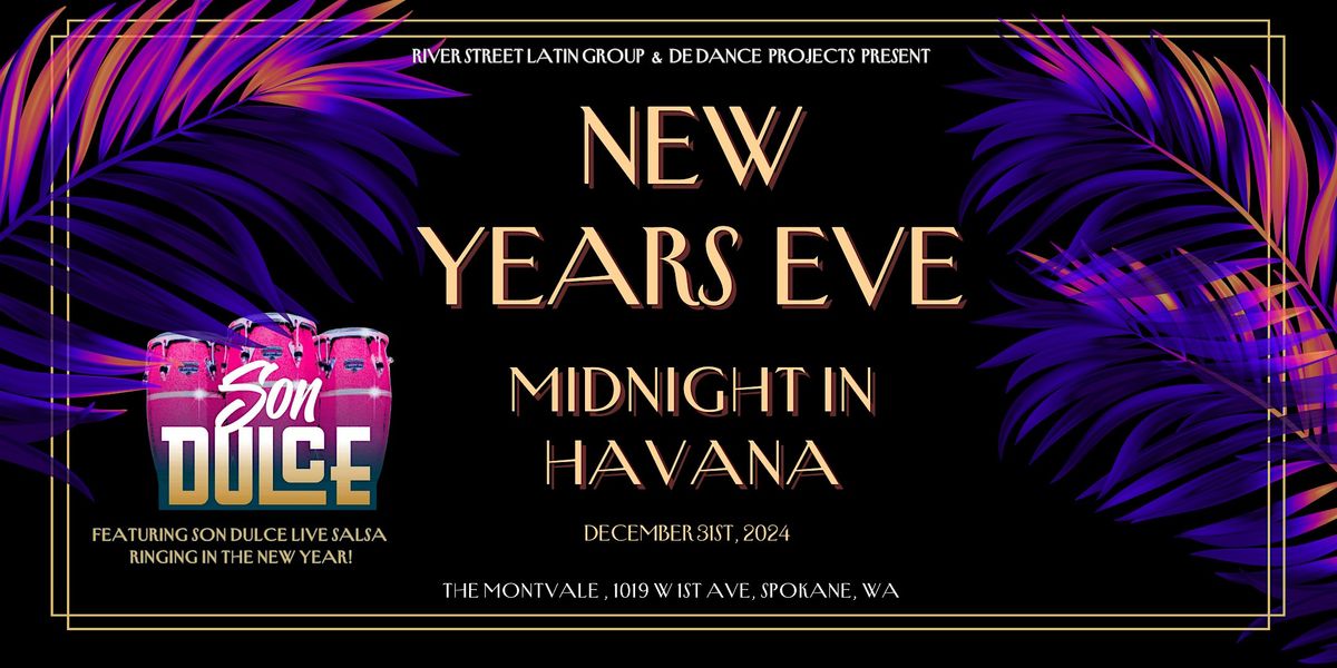 Join us for a vibrant New Years Eve celebration "Havana Style" at the Montvale Ballroom (3rd floor historically known as Ella’s Supper Club) in downtown Spokane on December 31, 2024! This Cuban themed event unites the lovers of music, dance, and Latin culture through a nostalgic, energetic, sexy, and vibrant cultural experience. This year we bring midnight in Havana to Spokane and celebrate with the tropical Latin rhythms that will make you dance the night away! Enjoy the live music (Salsa, Cumbia, and Cha Cha's) performed for you by Spokane's Son Dulce Live Salsa band. DJ Eddie will be peppering the night with a specially currated list of classic and modern songs from Cuba, Puerto Rico, Dominican Republic, NYC, and around the world.