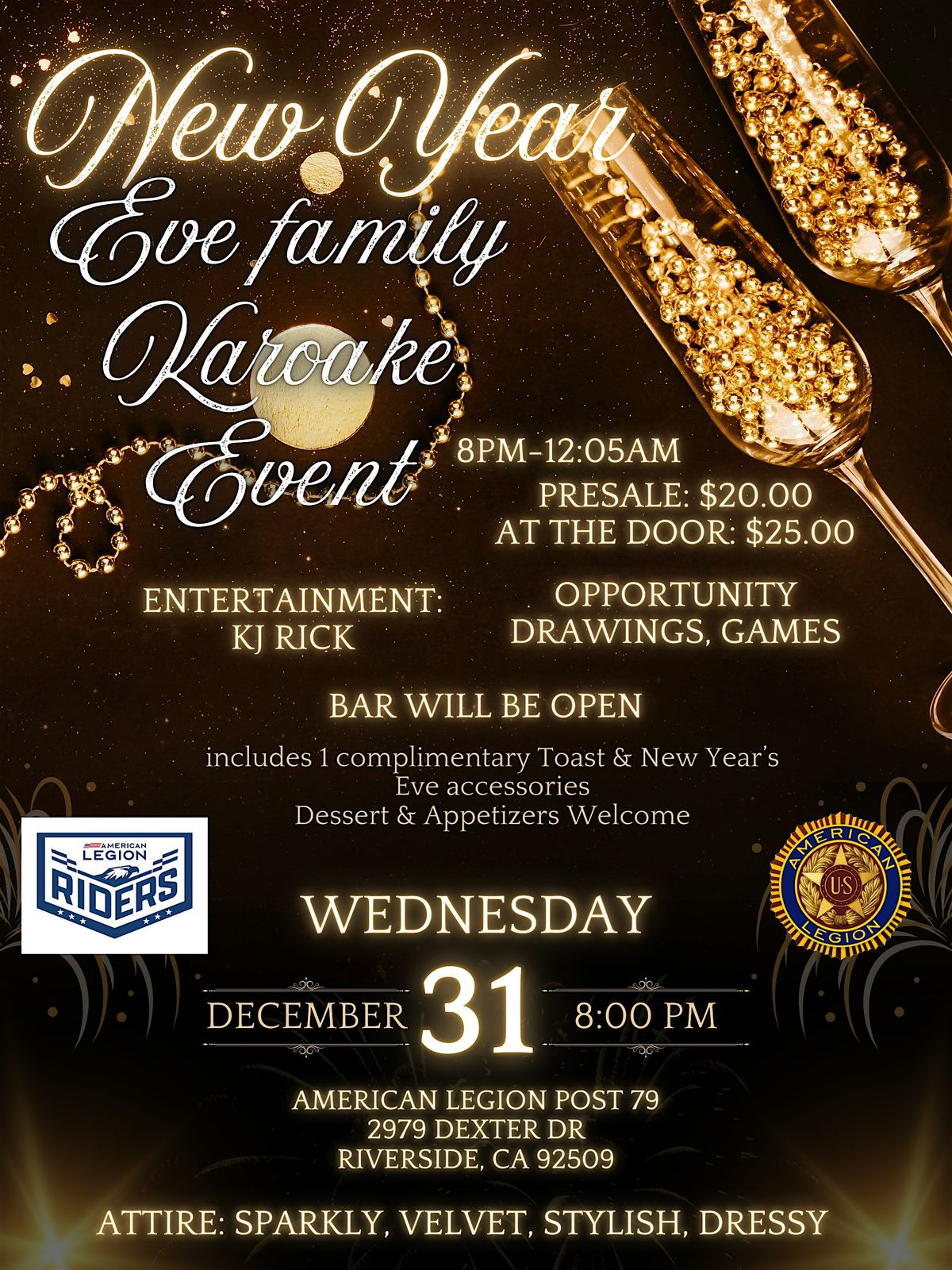 Celebrate NYE 2026 with your family! Music, games, and memories await at American Legion Post 79. Join us!!! Karoake & Dance Contest!!
