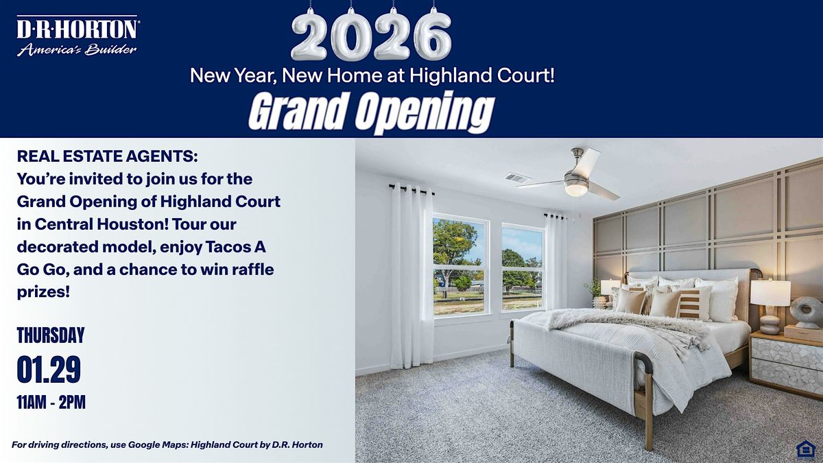 Applies to the New Year, New Home at Highland Court Grand Opening on 01/29/2026 in the D.R. Horton Highland Court community. Event is subject to change. Complimentary food and refreshments provided by D.R. Horton, and are available on a first come, first serve basis, while supplies last. Participants assume the risk of participating in any activities. Comparable retail price of all prizes is approximately $252, consisting of a total of one Gimbal ($52 retail value) and one $200 Visa® gift card. Tacos A Go Go® and Visa are not sponsors of this event or affiliates of D.R. Horton. Each attendee will be entered in a random drawing to win a prize. Winners to be selected by random drawing at 2pm on 01/29/2026. Need not be present to win. Limit one prize per attendee. D.R. Horton has final determination on eligibility of winners. Quantities are limited to the amounts noted herein. Must be a licensed real estate agent or broker in Texas and over the age of 18. Attendees are not required to purchase goods or services, pay any money, or submit to a sales promotion effort as a condition to attend this event or win a prize. Employees and family members of D.R. Horton are not eligible for this promotion. Additional restrictions may apply. Contact a sales representative for complete details. D.R. Horton may cancel or change all offers without prior notice. Buyer’s agent must accompany and register buyer on first visit to the community. Equal Housing Opportunity. Revised 01/13/2026.