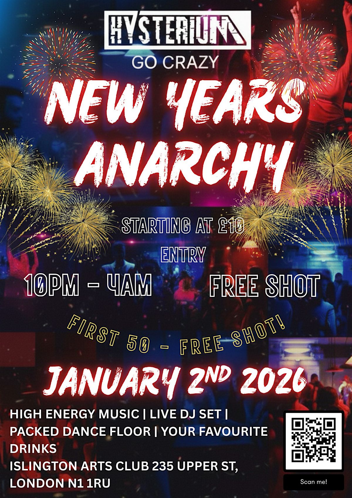Get ready to kick off the year with some serious chaos and good vibes! Join us in person for the New Years Anarchy event – a night full of unpredictable fun, wild energy, and epic memories. No suits, no rules, just pure anarchy to welcome the new year. Bring your crew and let's make this celebration one for the books!