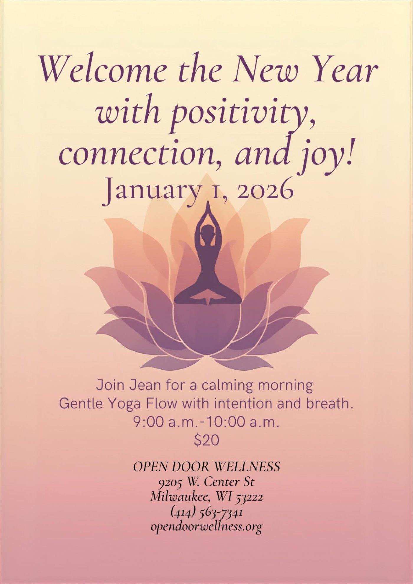 Welcome the New Year with positivity, connection, and joy! Join us for a calming morning Gentle Yoga Flow with intention and breath. We look forward to stepping into the New Year with you by practicing movement, intention, and breath in a welcoming inclusive space. Please bring your own Yoga mat (small number of mats available in the studio, if needed) and closed water container. $20 registration fee paid through our website or the MindBody app under "Open Door Movement Studio".