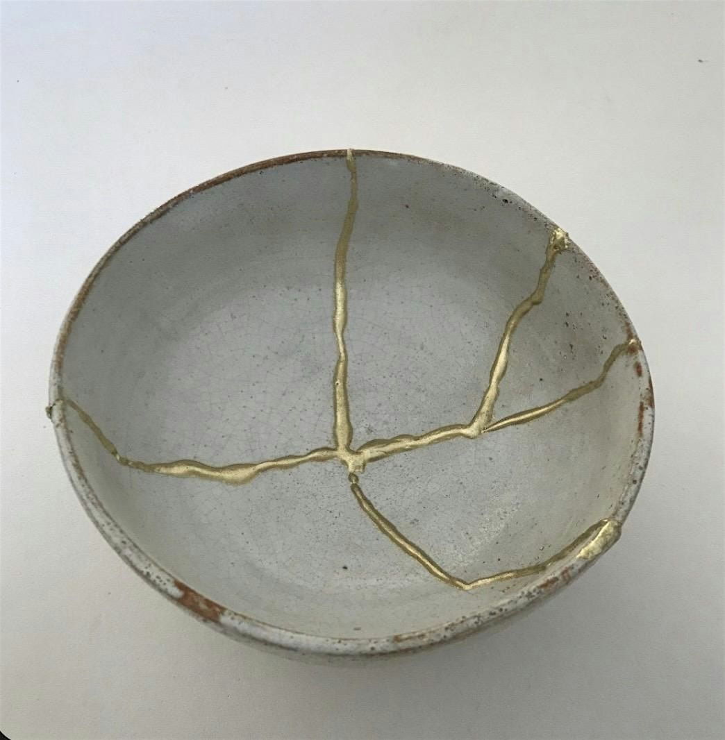 Kintsugi is the Japanese method of repairing broken pottery by fusing the cracks together and highlighting them with gold.