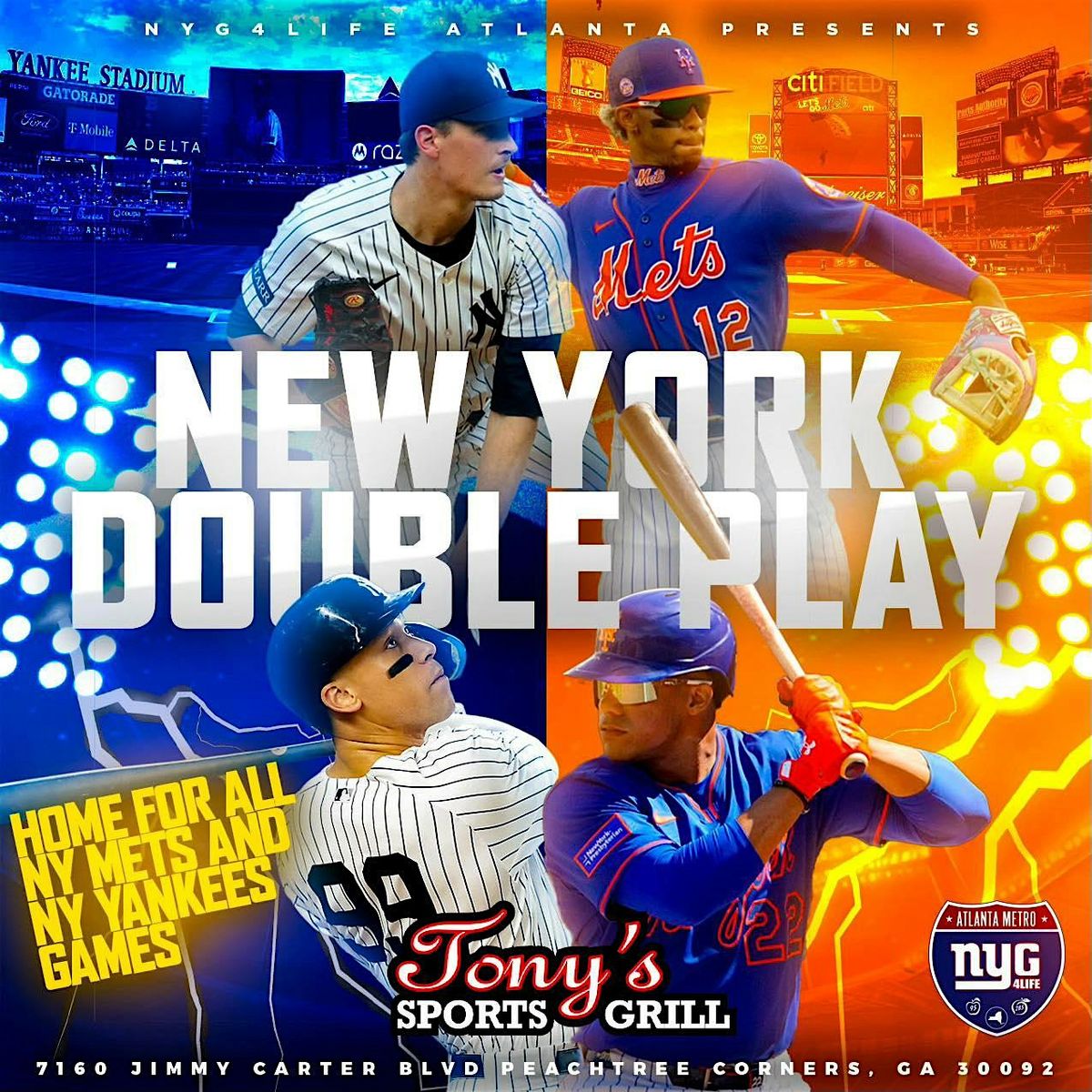 NYG4LIFE ATLANTA (The Largest New York Giants Fan Club in Atlanta) would like to invite ALL BASEBALL FANS out to the NEW YORK DOUBLE PLAY @ Tony’s Sports Grill in Peachtree Corners the home for ALL NEW YORK METS & NEW YORK YANKEES games this season as we patiently wait for football seaaon to get started.