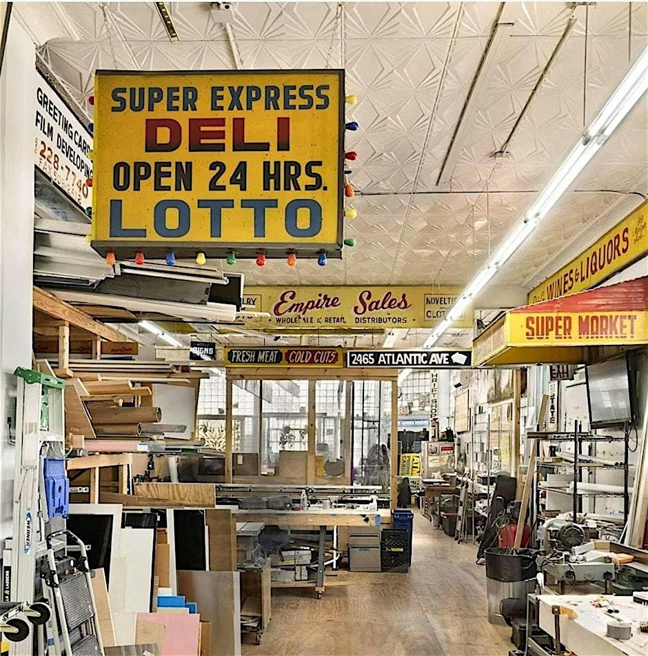 See the collection and an active sign shop where signs are still made the old-fashioned way, situated in an amazing one-of-a-kind prewar factory space with original details including glass block walls, art deco tin ceilings, stained glass dividers, and a functioning dumbwaiter.