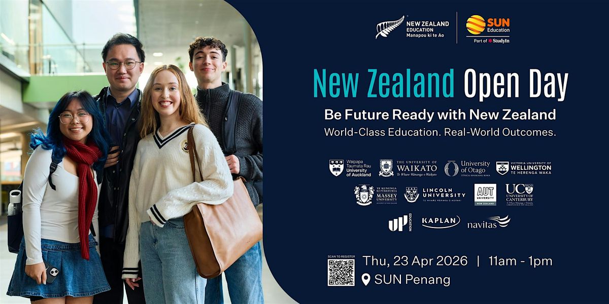 Join us at SUN Education Malaysia - Penang for the New Zealand Open Day on April 23, 2026 at 11:00 AM (MYT). It’s a great chance to explore study options, chat with experts, and get all your questions answered about studying in New Zealand. Don’t miss out on this fun and informative day, see you there!