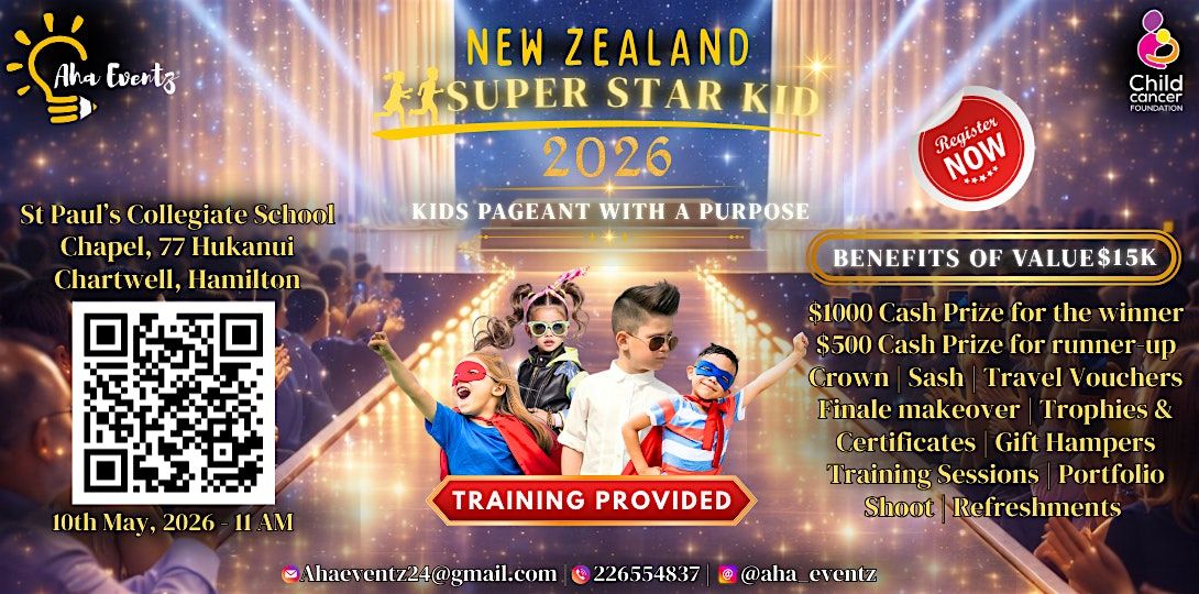 Join us for New Zealand Super Star Kid 2026, a unique and purpose-driven kids pageant designed for children aged 4–9 years. This national-level event provides a platform for young talent to build confidence, express themselves, and shine on stage in a fun and supportive environment.