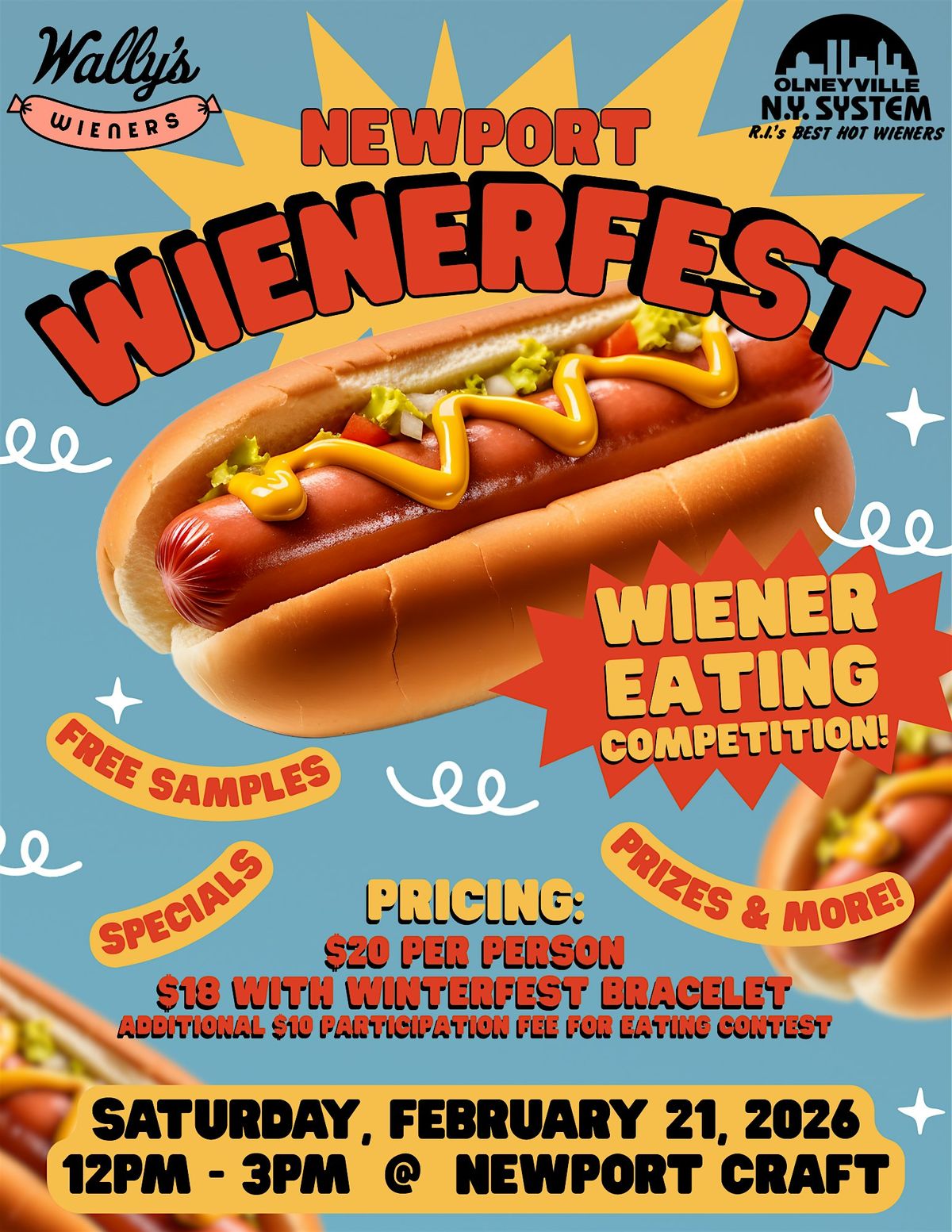 Join us Saturday, February 21, 2026, from 12–3 PM at Newport Craft Brewery for a sizzling afternoon celebrating everyone’s favorite hot wieners. Admission is $18 in Advance/ or with a Winterfest Bracelet at the door / $20 per person without bracelet.Enjoy food and drink specials, free samples, prizes, and more throughout the event. Think you can handle the heat? Sign up for theWiener Eating Competition at 1:30 PM — $10 entry, limited spots, and serious bragging rights up for grabs!Come hungry, bring your friends, and don’t miss Newport’s hottest new Winter Festival tradition.