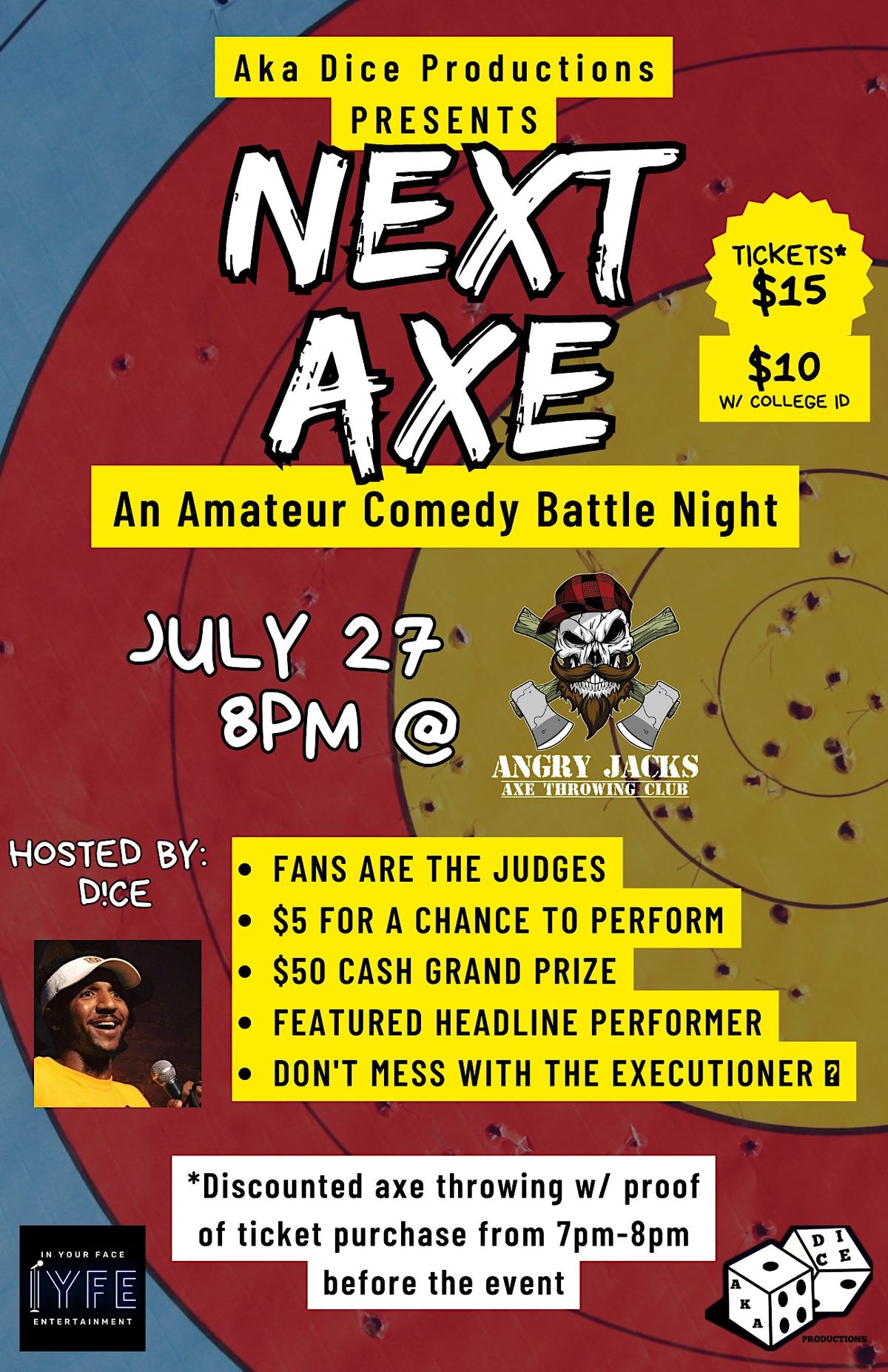 Come with your friends and family because here the CROWD is the JUDGE! If you like an act, chuck them some love, but if you don't then the excuetioner will chuck them the AXE! Come experience the thrill of axe throwing and joy of comedy jam packed into 1! Discounted axe throwing w/ proof of ticket purchase will also be available from 7pm-8pm before the event.