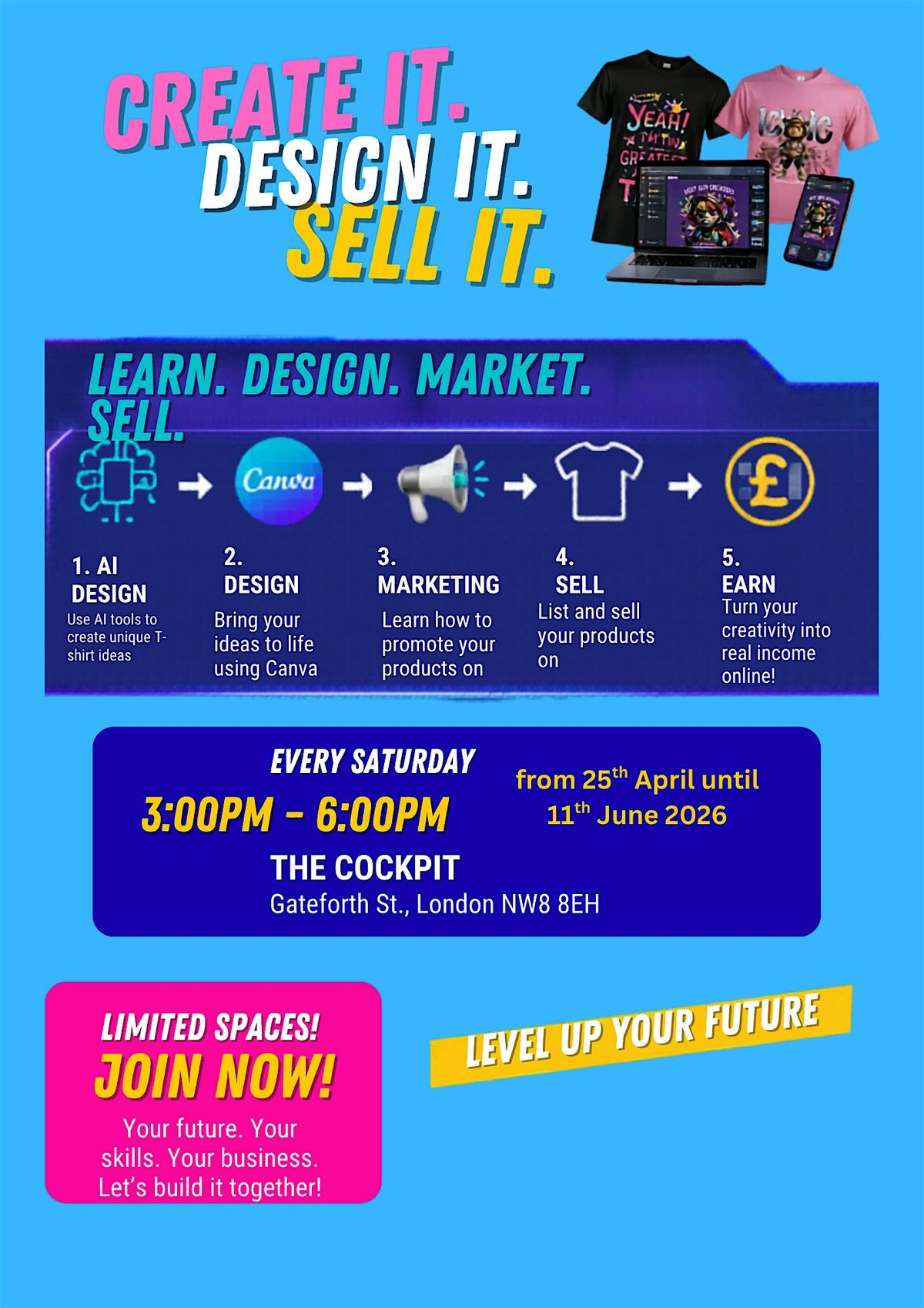Join our weekly hands-on workshop where you’ll learn how to design, market, and sell your own T-shirts