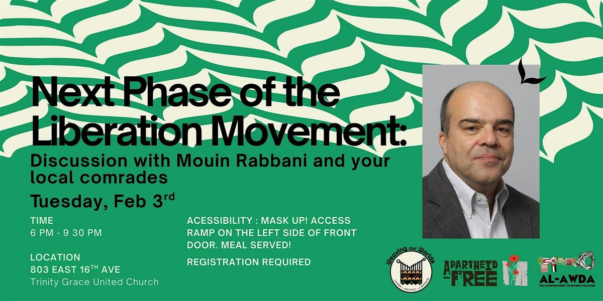 Drawing on Mouin Rabbini's vast expertise and experience, we will talk together and in small groups about assessing this moment, what the next phase of the Palestinian liberation struggle looks like globally and locally, and what we each need and can offer to move forward the struggle for liberation. From the river to the sea, Palestine will be free!