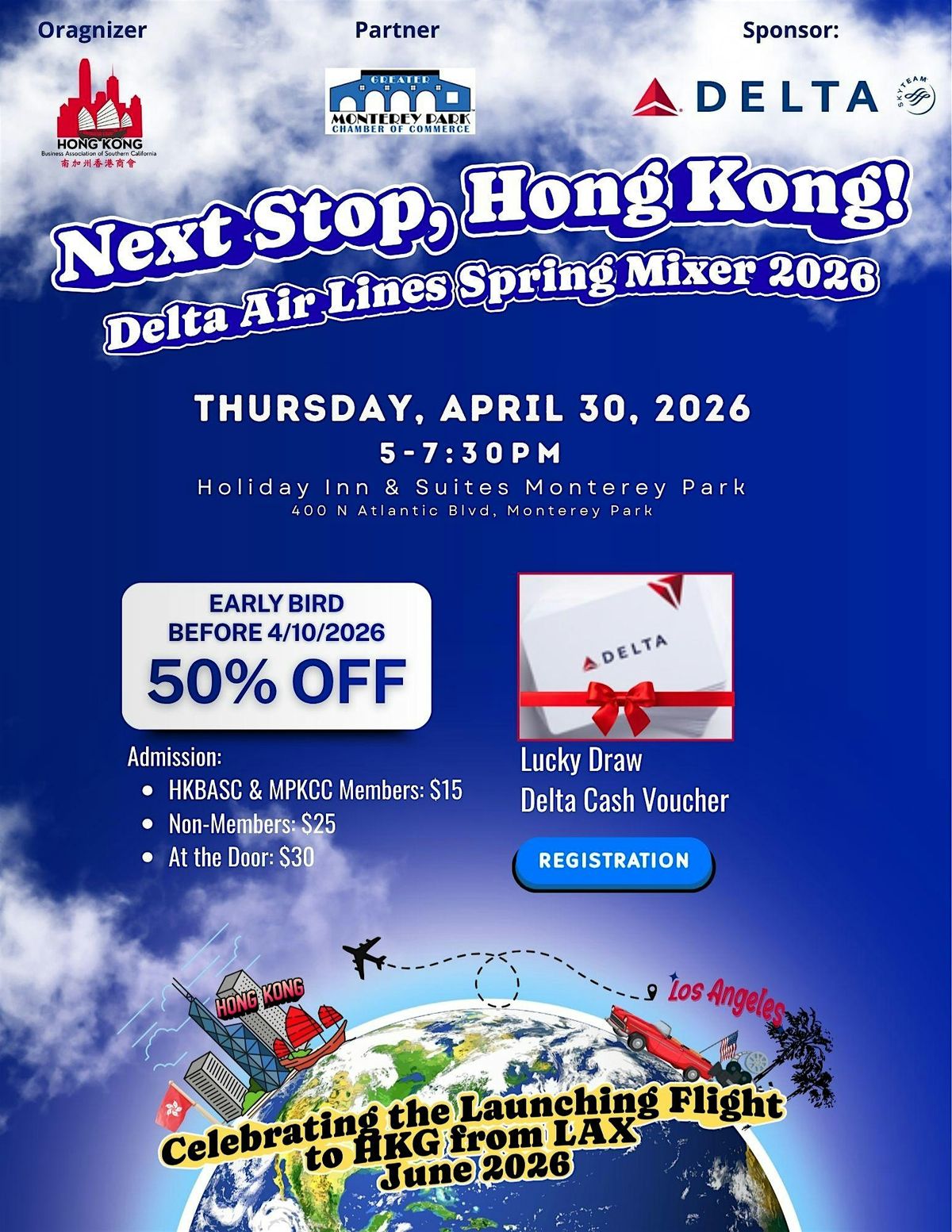 Get ready for an amazing time at the Delta Air Lines Spring Mixer 2026. Join us to celebrate the new LAX–HKG route! Enjoy delicious food and drinks, great company with HKBASC, and exciting lucky draw prizes including Delta Air Lines cash vouchers.