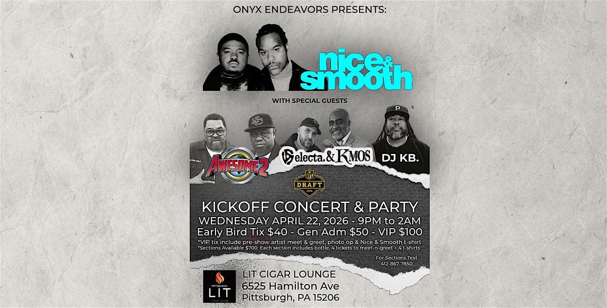 On the eve of the NFL Draft join Hip-Hop legends Nice & Smooth, DJ Teddy Ted and DJ Special K with Pittsburgh's own Selecta & KMOS and DJ KB. ! It's the perfect way to kick off NFL Draft Week with dope beats, fresh rhymes, good vibes, and an unforgettable party atmosphere. Don’t miss out on this awesome event that set the tone for the largest event Pittsburgh has ever hosted. This is a can't miss event for your draft week itinerary.
