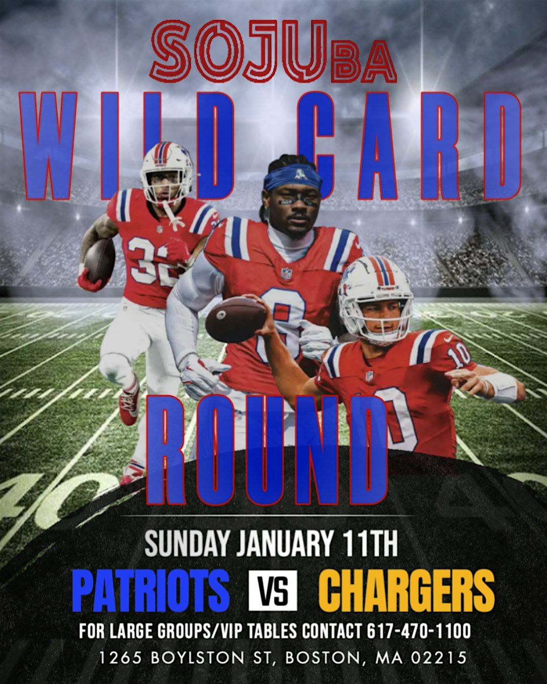 NFL WILD CARD SUNDAY NIGHT: Patriots VS Chargers Watch Party at SOJUba