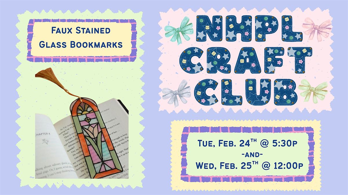 Join us each month as we tackle a unique craft, explore new techniques and mediums, and create a community of like-minded makers! February’s craft is faux stained glass bookmarks! This event is intended for adults and older teens (15+). If you do not have a NHPL library card, please email [email protected] to register so that we can make sure we have enough supplies!