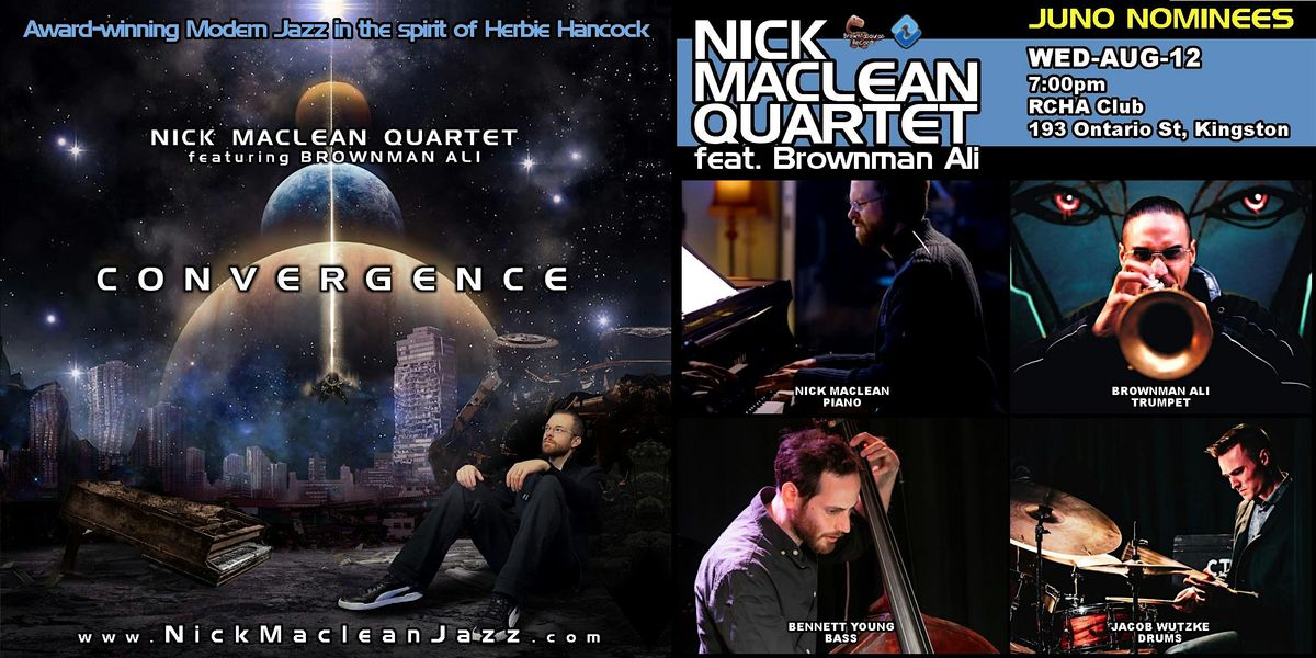 This August, the NICK MACLEAN QUARTET feat. BROWNMAN ALI performs music from their JUNO NOMINATED sophomore album CONVERGENCE. Led by fast-rising piano star NICK MACLEAN -- a 10x Global Music Award winner and one of the most in-demand young jazz piano players in Toronto -- this contemplative yet thrilling quartet delivers jazz between the two poles of thoughtful introspection and powerhouse conveyance, taking influences from Herbie Hancock's primordial 1960's Blue Note era recordings. Maclean's quartet heavily features one of Canada's most provocative improvising trumpet players -- BROWNMAN ALI -- an internationally acclaimed, multi-award winning jazz iconoclast who has been heralded as "Canada's preeminent jazz trumpet player" by New York City's Village Voice and is best known globally as the last trumpet player to play in the legendary jazz-hip-hop group GURU's JAZZMATAZZ. For this show, Ali & Maclean stand shoulder-to-shoulder with 2 of Canada's top-tier rhythm section players: BENNETT YOUNG on upright bass, and JACOB WUTZKE on drums.
