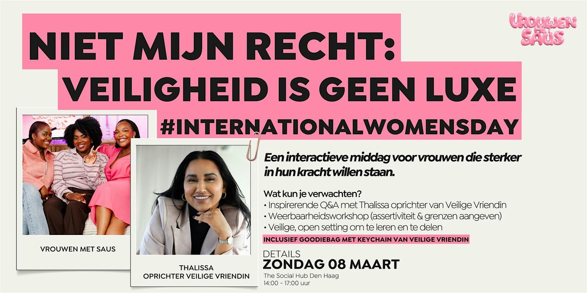 Veiligheid zou geen privilege moeten zijn, maar een recht. Toch is dat voor veel vrouwen niet vanzelfsprekend. Op Internationale Vrouwendag nodigt Vrouwen met Saus je uit voor een interactieve middag waarin we samen leren hoe je veiligheid herkent, grenzen bewaakt en sterker in je kracht staat.