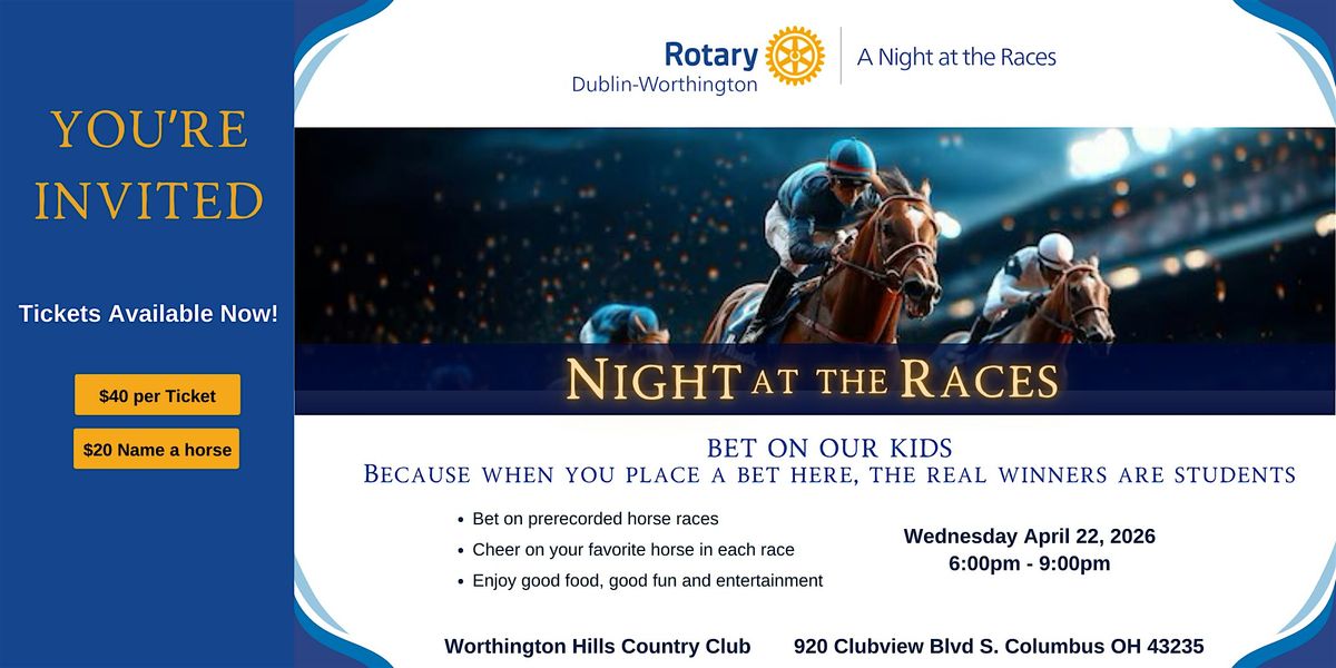 Get ready for a Night at the Races like no other, presented by the Dublin-Worthington Rotary Club! This is your chance to experience the thrill of horse racing, all while supporting a great cause. Join us at the Worthington Hills Country Club for an unforgettable evening filled with excitement, laughter, and plenty of surprises.